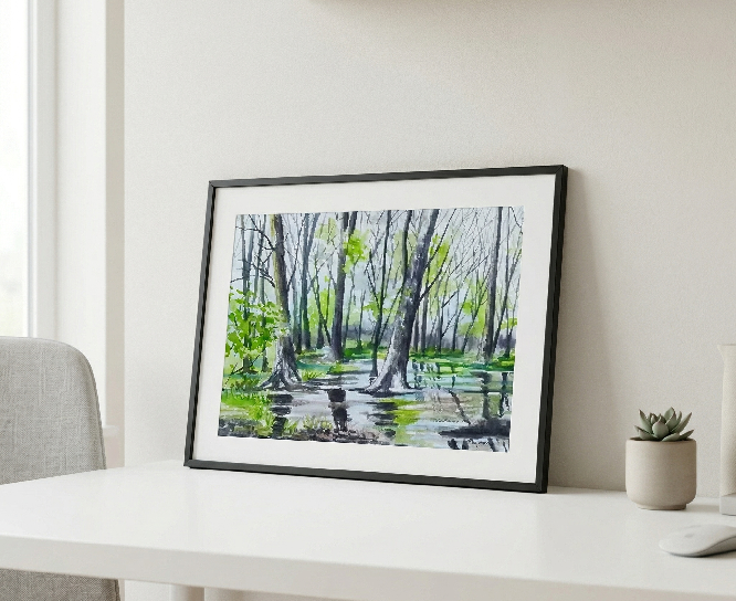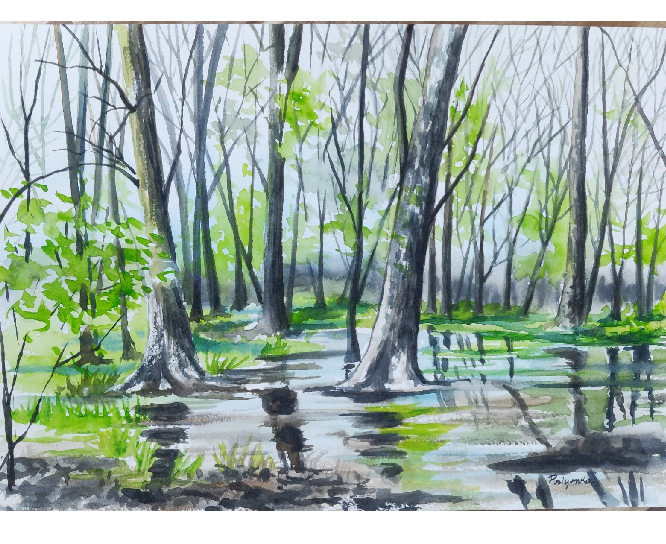 Landscape painting capturing wetland textures and tones.