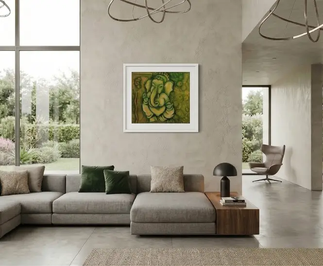 A textured mixed media artwork combining clay and oil painting that portrays Lord Ganesha with earthy tones and divine presence.