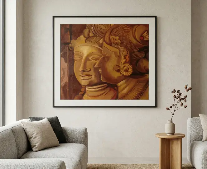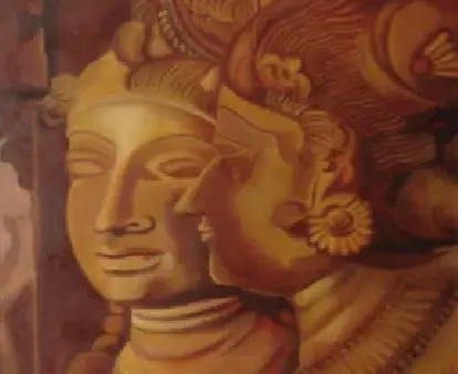 An artistic interpretation of the iconic Khajuraho sculptures blending classical heritage with contemporary color expression.
