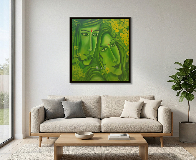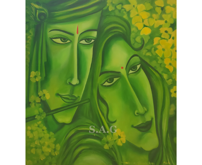 A vibrant oil painting portraying Radha and Krishna representing eternal love and divine connection.