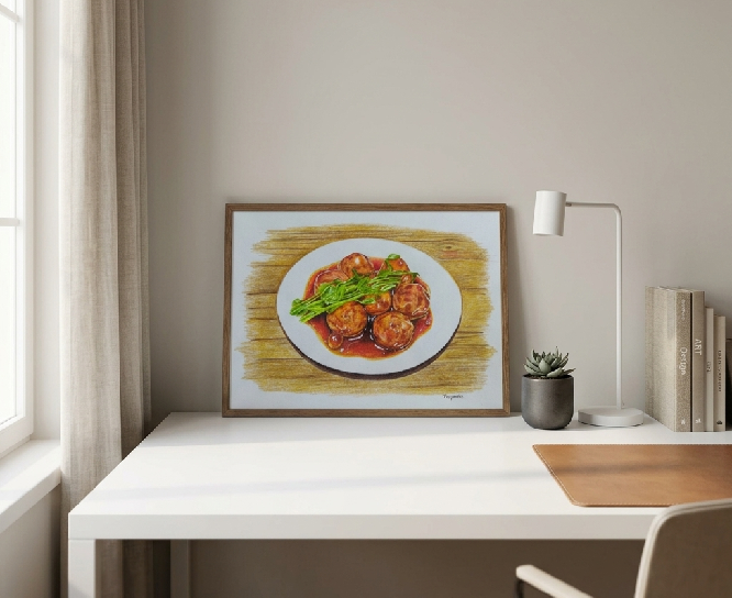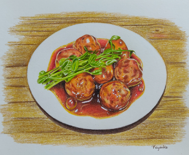 Savory food painting focusing on texture and depth of ingredients.