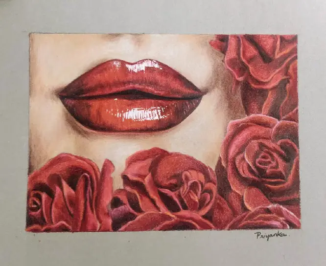 Floral artwork blending roses with subtle text elements.
